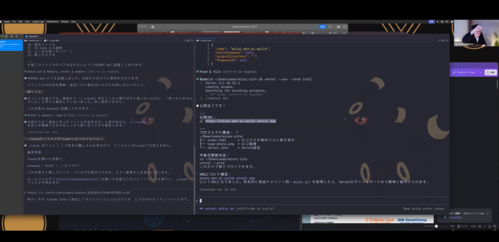 講師の田中さんが実演してくれたのは、複雑なコーディング作業をAIに丸投げする様子です。